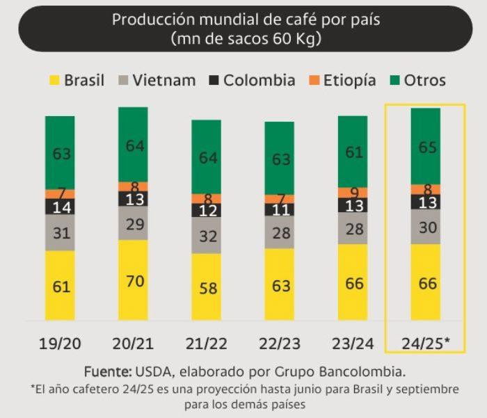 Aunque, según el Departamento de Agricultura de Estados Unidos (USDA), "Brasil incrementó su cosecha en la temporada 2023/24 en un 6 % frente a la temporada anterior, las exportaciones crecieron un 29 % (incluyendo café verde y procesados). Como resultado, los inventarios del país cayeron un 64 %", se lee en la investigación.